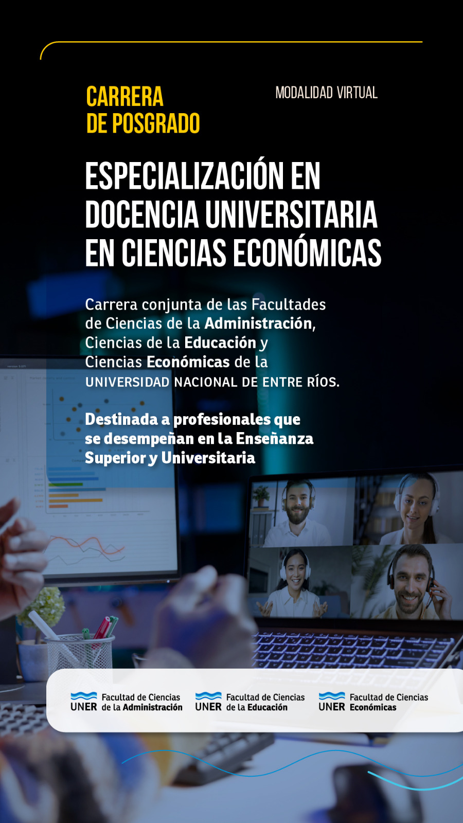 Las Facultades de Ciencias de la Educación, Ciencias Económicas y Ciencias de la Administración de la Universidad Nacional de Entre Ríos desarrollarán de manera conjunta la Especialización en Docencia Universitaria en Ciencias Económicas (Dictamen CONEAU IF-2025-127638933-APN-CONEAU#MCH), una propuesta de posgrado destinada a profesionales que se desempeñan en la enseñanza superior y universitaria.