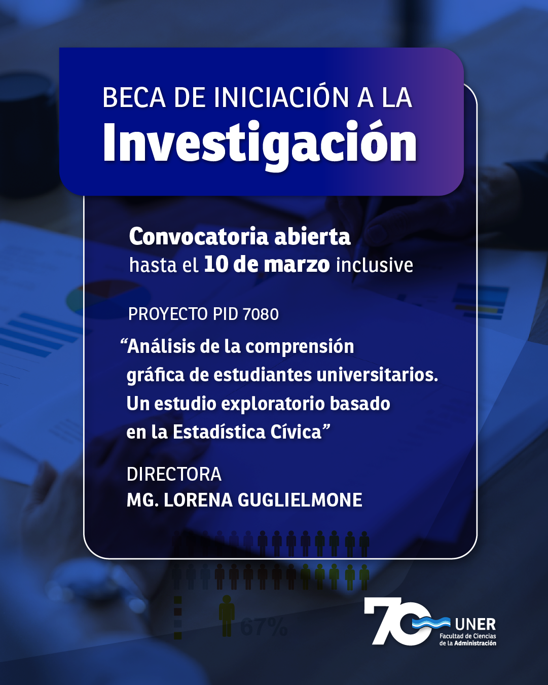 Se encuentra abierta la convocatoria a cubrir una (1) Beca de Iniciación a la Investigación en el marco del proyecto PID 7080 titulado “Análisis de la comprensión gráfica de estudiantes universitarios. Un estudio exploratorio basado en la Estadística Cívica” dirigido por la Mg. Lorena Guglielmone