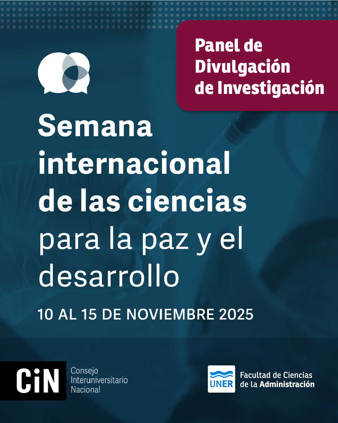 En el marco de la Semana Internacional de la Ciencia, organizada por el Consejo Interuniversitario Nacional, la Facultad invita a participar del Panel de Divulgación de Investigación, un espacio destinado a compartir y visibilizar el trabajo de los proyectos que impulsan el conocimiento desde nuestra institución.