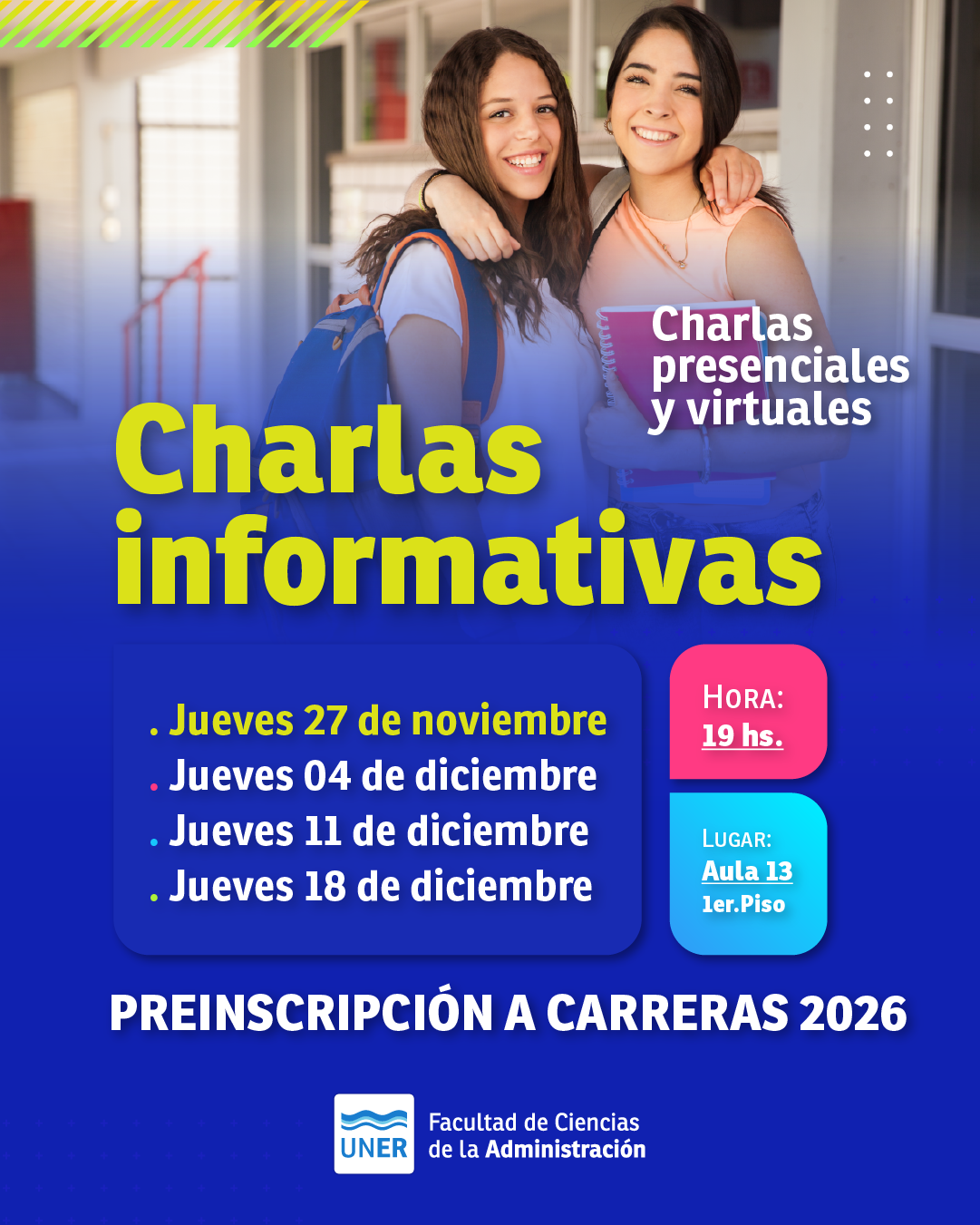 La Facultad de Ciencias de la Administración invita a futuros ingresantes a participar de las Charlas Informativas para el Ingreso 2026, un espacio destinado a brindar información sobre la oferta académica, los requisitos de inscripción y el inicio de la vida universitaria.
