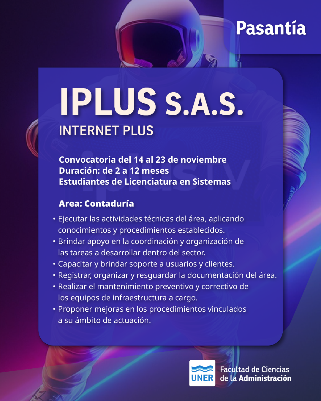 Se encuentra abierta la convocatoria para pasantías educativas, la misma es solicitada por IPLUS S.A.S. A continuación se detallan las áreas que solicitan pasantes, tareas, duración, horarios, requisitos y asignación estímulo.
