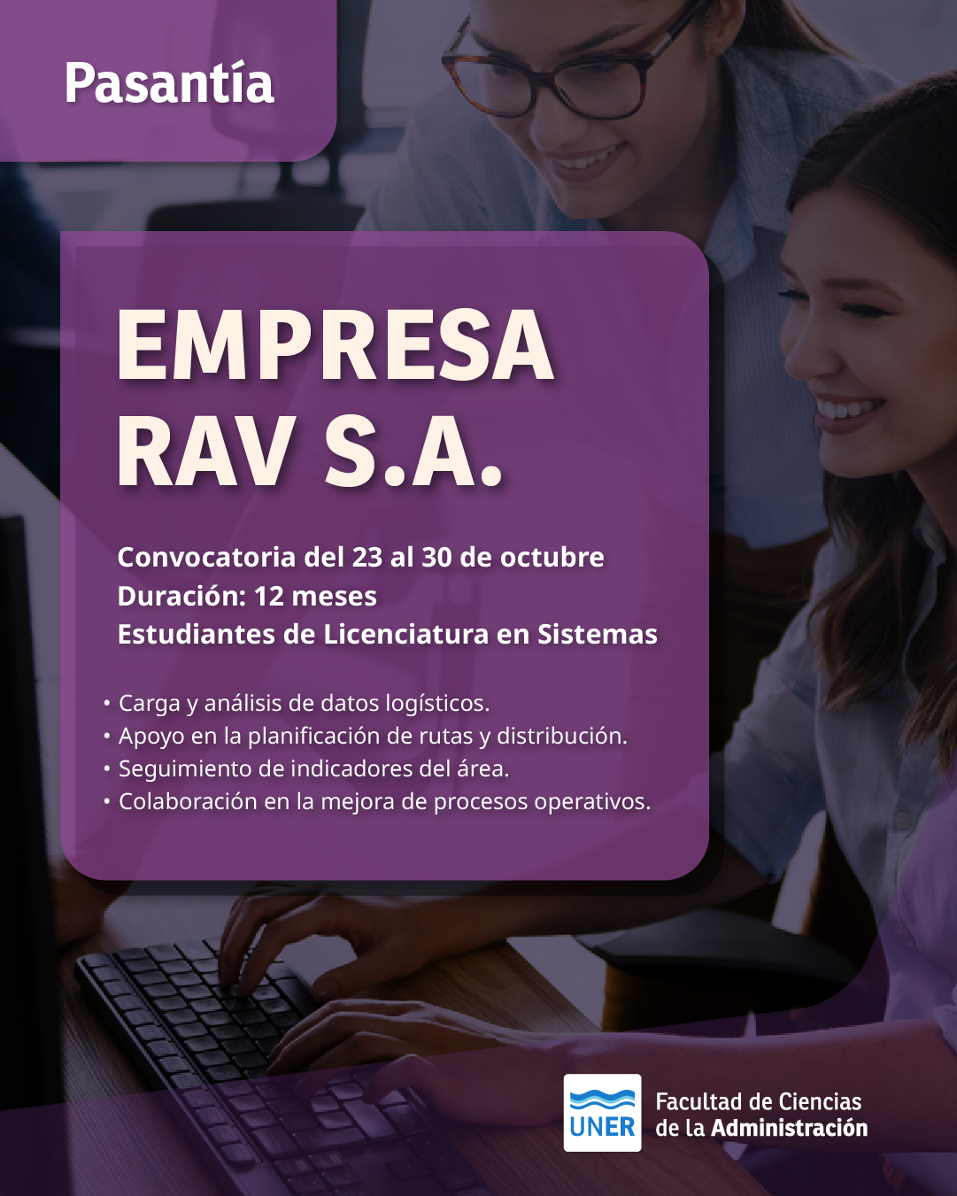 Se encuentra abierta la convocatoria para pasantías educativas, la misma es solicitada por la empresa RAV S.A. A continuación se detallan las áreas que solicitan pasantes, tareas, duración, horarios, requisitos y asignación estímulo.
