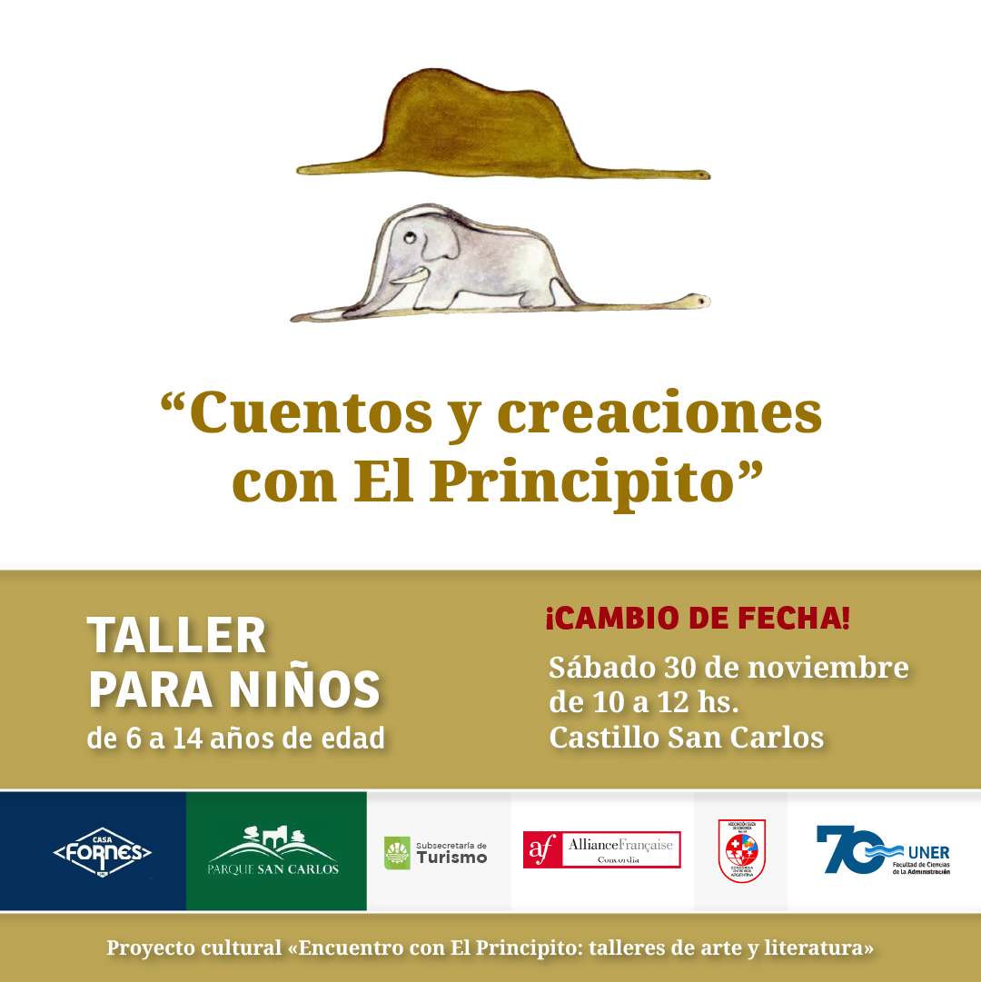 👉Este taller es parte del proyecto cultural «Encuentro con El Principito: Una Aventura Cultural y Literaria», organizado por la Facultad de Ciencias de la Administración, en colaboración con la Alianza Francesa de Concordia, la Asociación Suiza de Concordia, la Subsecretaría de Turismo de la ciudad y el Parque San Carlos. Nos acompaña Casa Fornés.