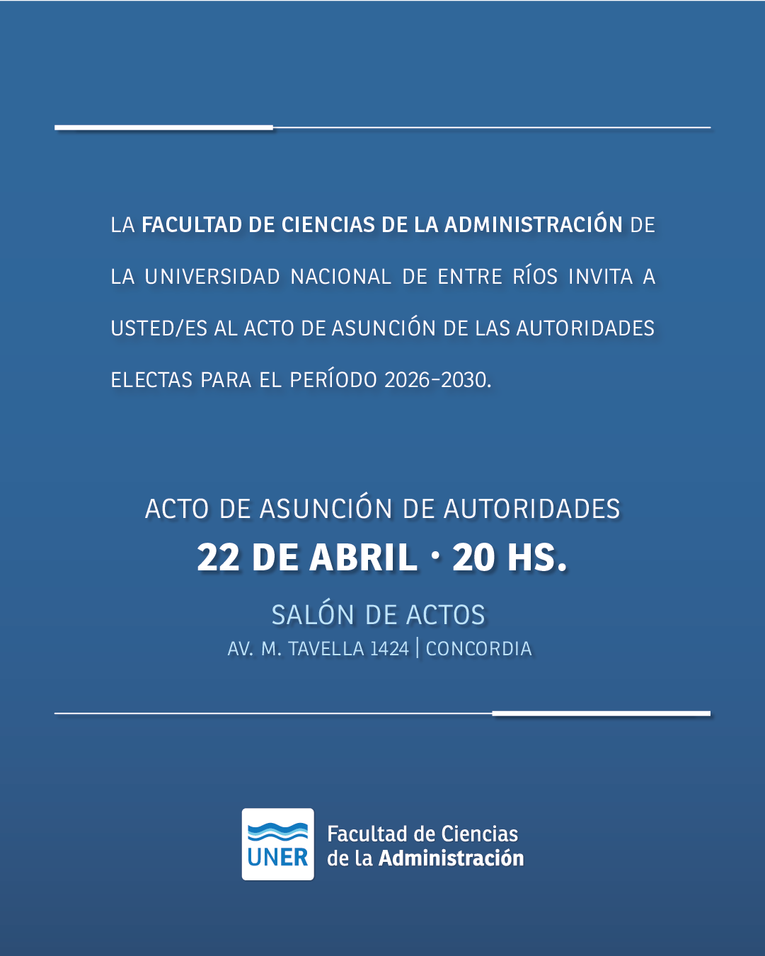 La Facultad de Ciencias de la Administración invita a la comunidad universitaria y al público en general a participar del acto de asunción de autoridades correspondientes al período 2026–2030.
